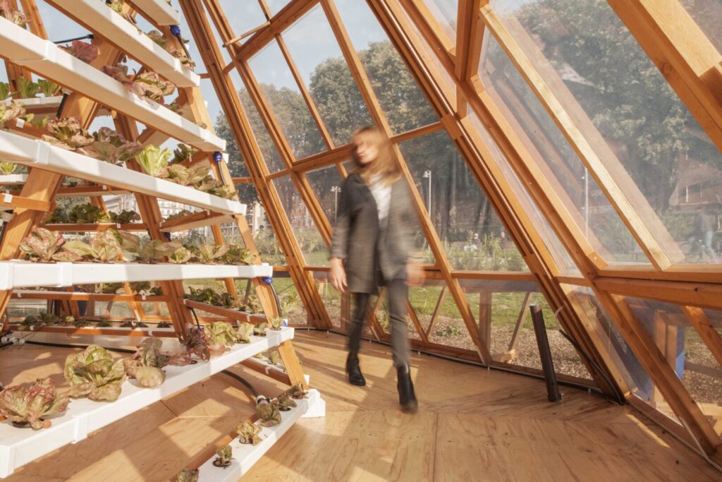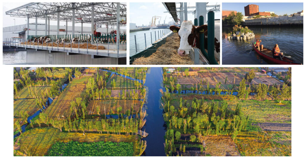 I Floating gardens – o ‘orti galleggianti’ – non sono invenzioni recenti. Nonostante nell’ultimo decennio siano state realizzate soluzioni ‘fluttuanti’ in molte aree urbane densamente popolate come Rotterdam, New York e Parigi, le loro origini e la loro storia ci conducono in Asia – in Bangladesh, Myanmar e India – dove sono ancora utilizzate per arginare gli effetti delle inondazioni, durante il periodo dei monsoni – e negli orti galleggianti in Messico – le chinampas – dove da migliaia di anni si coltivano terre emerse, circondate da un sistema di canali navigabili. Negli ultimi anni questi modelli sono stati reinterpretati con approcci tecnologici molto diversi. La fattoria galleggiante di Rotterdam (Floating farm), ad esempio, utilizza scarti urbani (erba dei campi sportivi o il grano di scarto delle birrerie locali) per alimentare le mucche, che producono il loro latte cullate da questa fattoria futuristica e sostenibile. A Singapore si utilizzano sensori e intelligenza artificiale per monitorare e ottimizzare i ‘kelong’, allevamenti ittici locali su piattaforme, così come negli Stati Uniti il progetto ‘Grown on us’ si avvale di fito-depurazione per ripulire le acque inquinate del Gowanus Canal a Brooklyn.